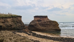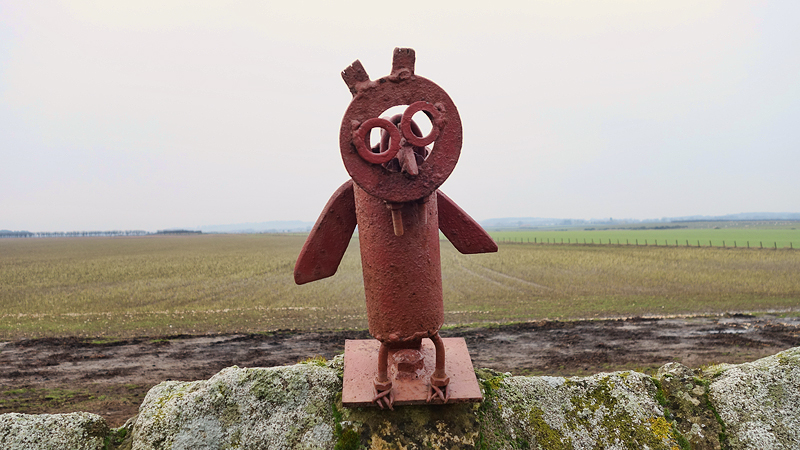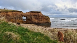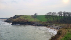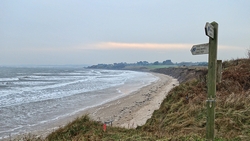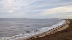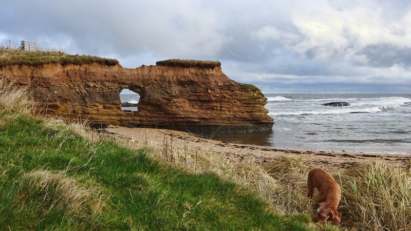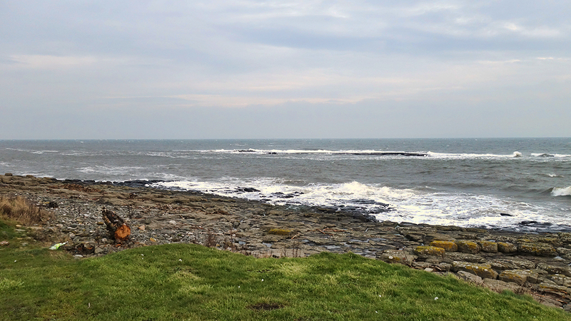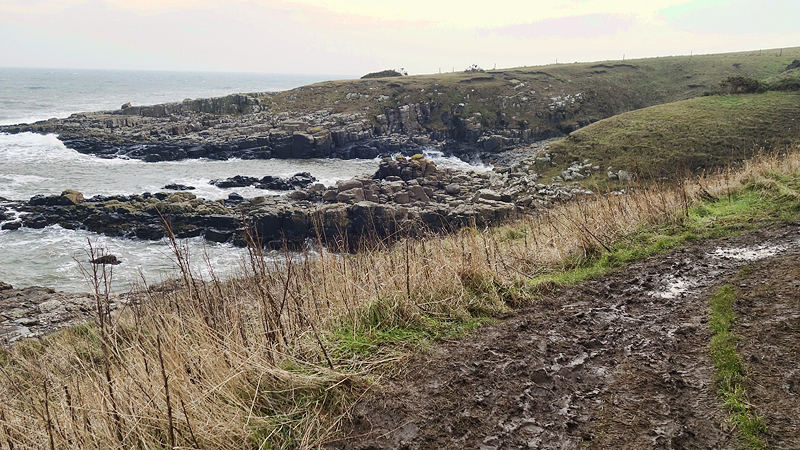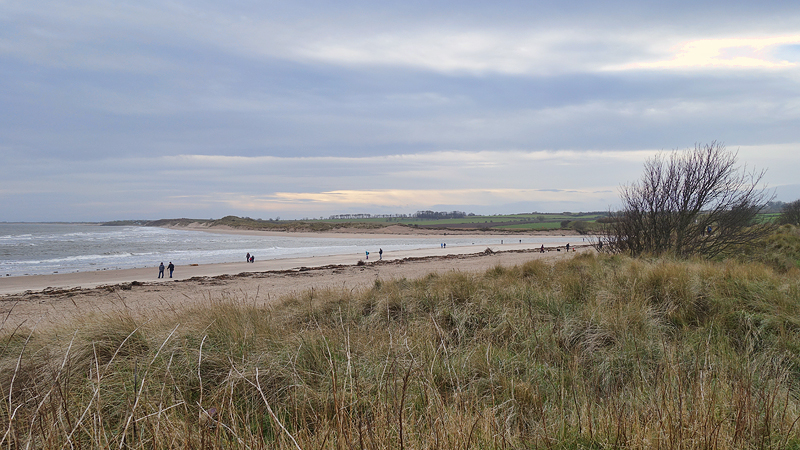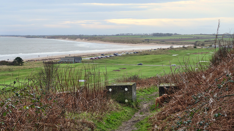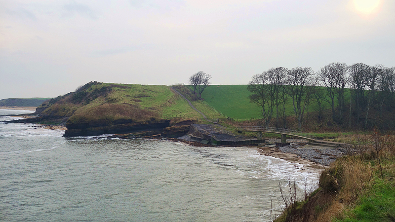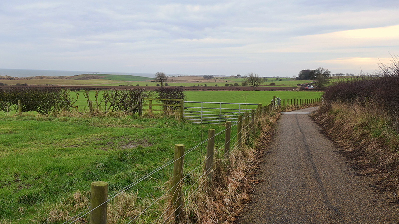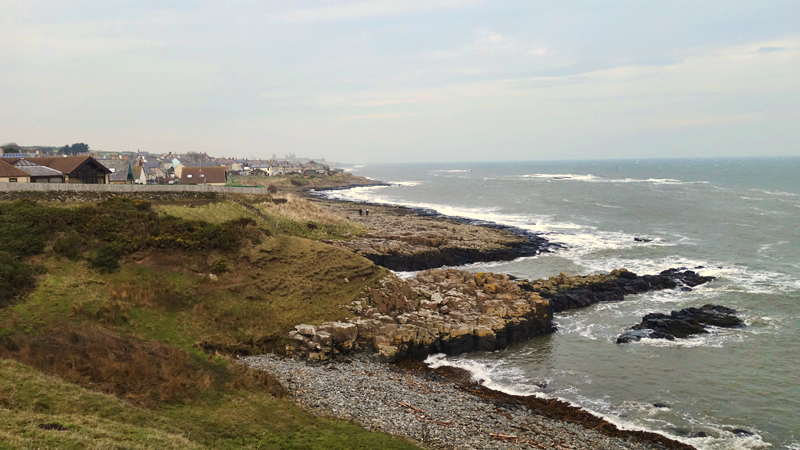 Dat was snel gevonden en ik kwam er al snel achter dat ik nu een heel stuk langs een weg zou lopen op een verhard pad. Niet zo leuk dus eigenlijk. Het liep als vals plat omhoog maar wat nu omhoog gaat, gaat straks weer lekker naar beneden! Het pad was veel langer dan ik dacht en ik keek enkele keren op de kaart of het echt wel zo moest allemaal maar ik liep echt de route. Eindelijk kon ik dan linksaf slaan richting de zee. Ik liep over een kloterig pad met grote ronde keien en kwam uiteindelijk op een parkeerplaats terecht waar enkele auto’s stonden. Mensen rijden hier dus werkelijk heen voor een wandelingetje over het strand terwijl Alnouth zo dichtbij is….