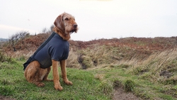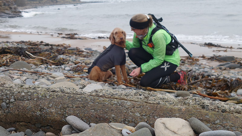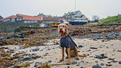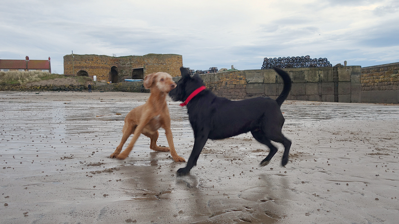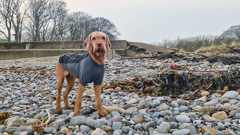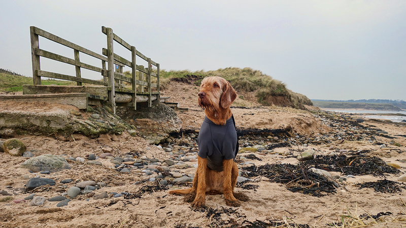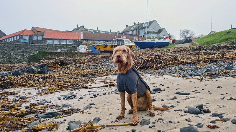 Nu nog even naar en door de duinen en terug naar de golfbaan. Dat laatste stuk gaat heel snel eigenlijk. Ik loop even naar het strand in de hoop dat ik de pootjes van woef een beetje schoon kan maken maar er is helemaal geen strand. Er is een smal strookje met keien dat ook steeds wordt overspoeld. Dat is altijd wel bijzonder hier. Normaal met laag water is hier een gigantisch strand, nu komt het water bijna tot het hek. Dat wordt dus niks en we gaan maar terug naar de auto. Daar maak ik de pootjes van woef lekker schoon en trek haar equafleece jasje aan. Lekker warm blijven nu want we zijn pas over 35 minuten thuis.