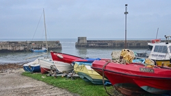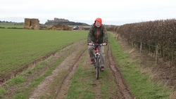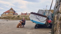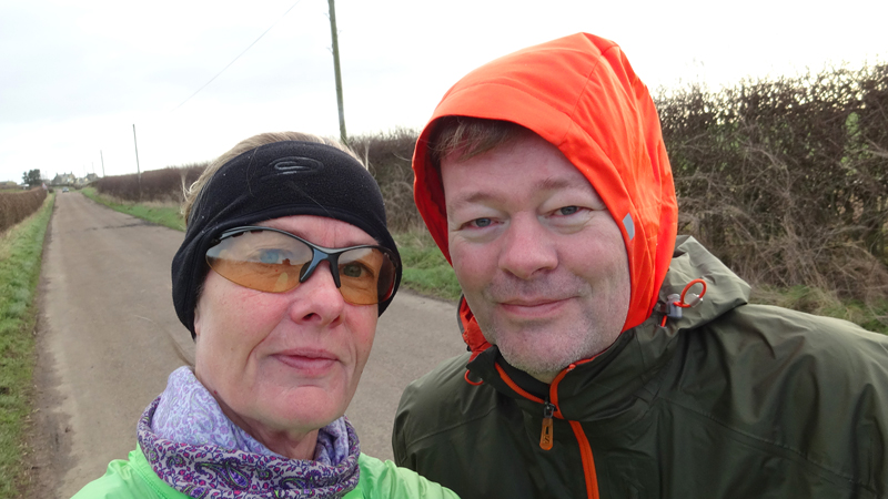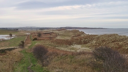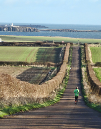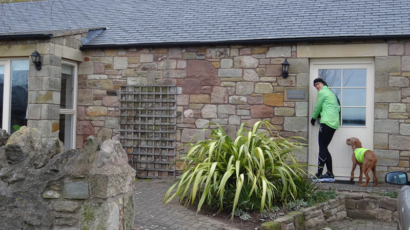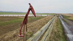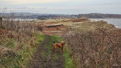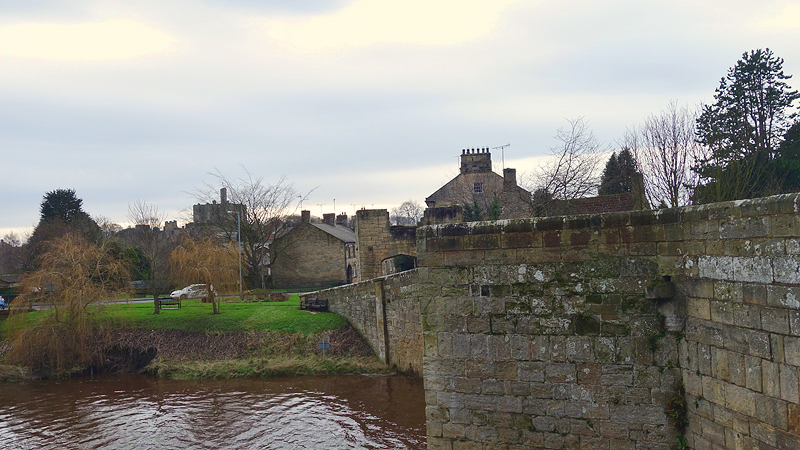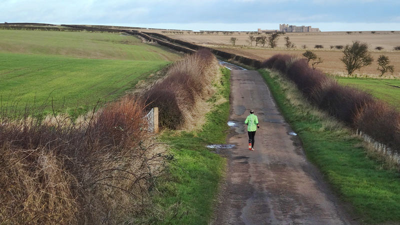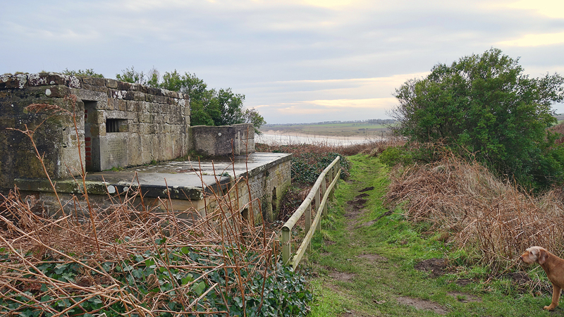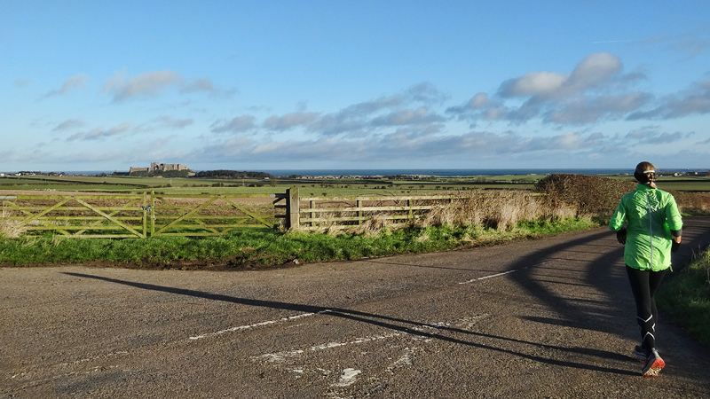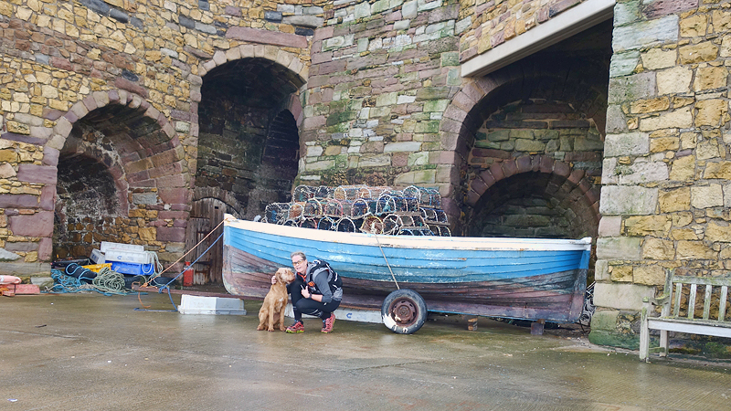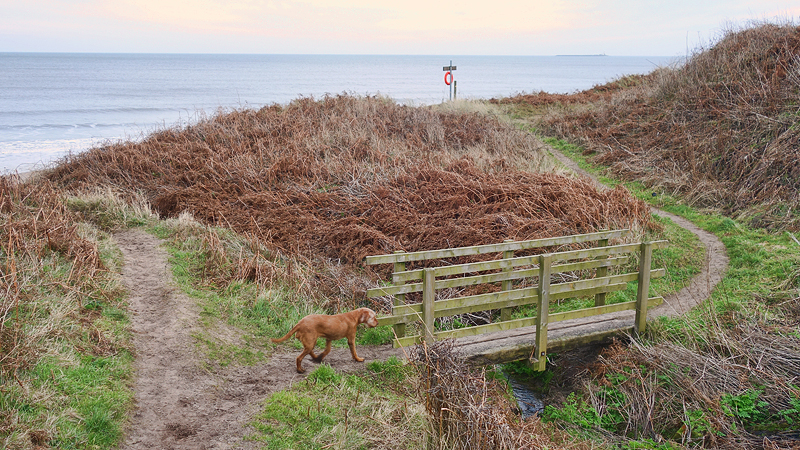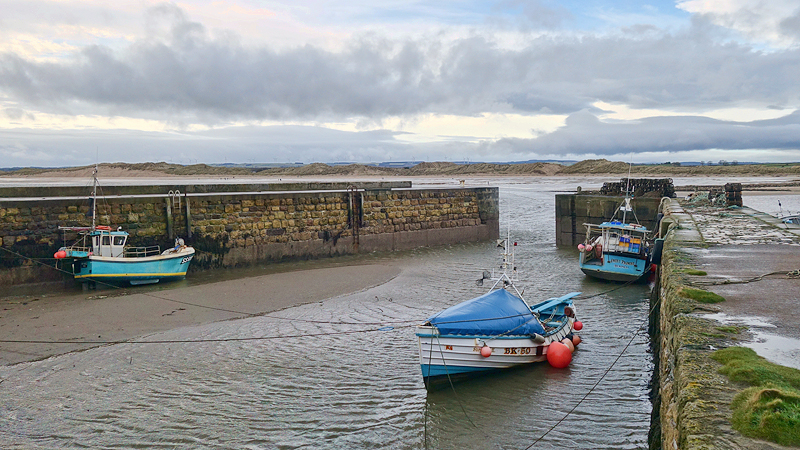 Maar nu wil ik wel verder eigenlijk en zonder verder te stoppen hobbel ik over het pad met de wind tegen zodat het snot uit mijn neus loopt. Gewoon doorlopen….. aan het einde rechtsaf en weer over het verharde pad terug naar Alnmouth. Eigenlijk merk ik nu pas dat ik op de heenweg dus blijkbaar dat vals plat had, want ik loop nu lekker naar beneden met de wind schuin in de rug. Niet verkeerd. Ik zie vanuit de verte alweer de stenen brug over de rivier en rechts van me zie ik Alnmouth al liggen met het inhammetje en de bootjes. Het lijkt allemaal heel ver zo maar ik weet dat het wel meevalt en al snel hobbelen we over de brug en slaan we alweer rechtsaf naar de bootjes.