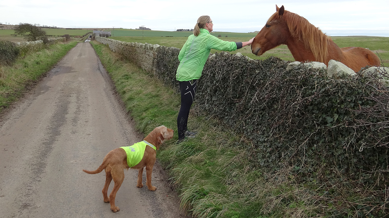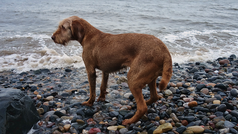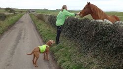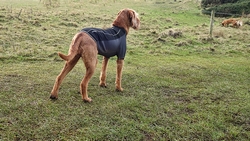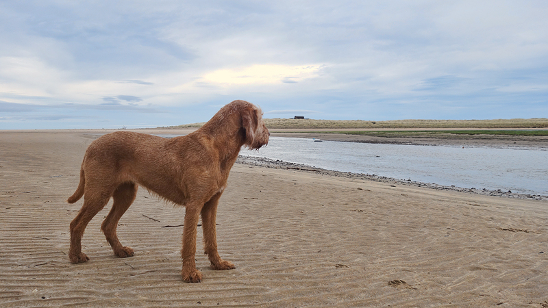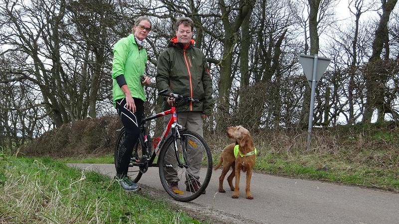 Daar is het inmiddels heel druk geworden en als ik de hobbelweg op wil lopen, krijgt iemand woef in het oog. Helemaal enthousiast roept ze naar me en vraagt of het een draadhaar Vizsla is. Ja dat kan ik beamen. Dat ze zo mooi is en of ze nog jong is. Ook hier raak ik dus weer aan de praat en pas na een tijdje kan ik weer verder met mijn jonge fitte woefje. Fans zijn altijd leuk. Ik hobbel over het rottige pad en een stukje verder word ik weer staande gehouden door iemand met twee jonge honden die ook vraagt of woef een Vizsla is…. Jajajaja….. Het is op zich wel grappig dat ze altijd hier zoveel fans heeft en mensen tegenkomt die haar mooi vinden.