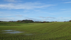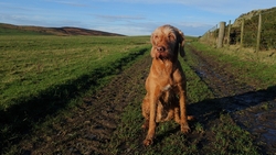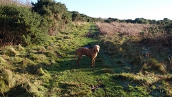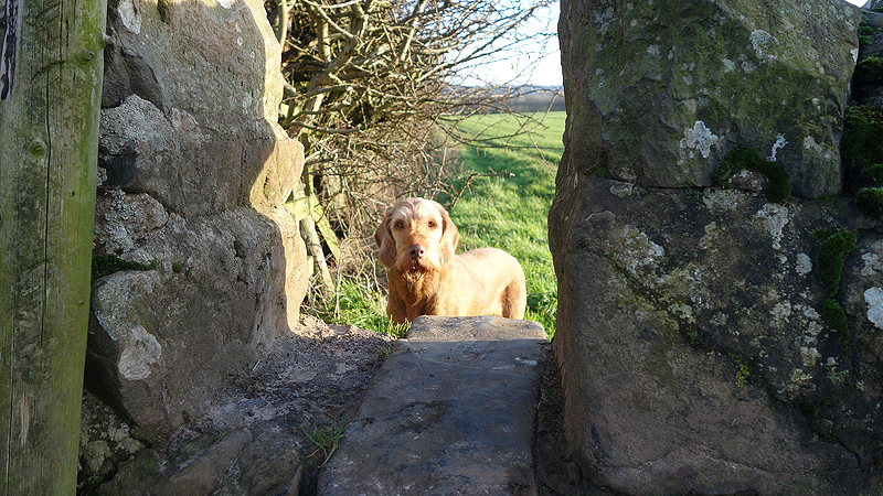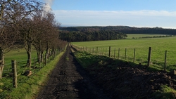Na een paar kilometer sla ik linksaf richting Detchant Woods. Hier moet woef even aan de riem maar dat is geen probleem met mijn lange dunne riempje. Die prop ik tussen mijn broekband en zo heb ik gewoon beide handen vrij.