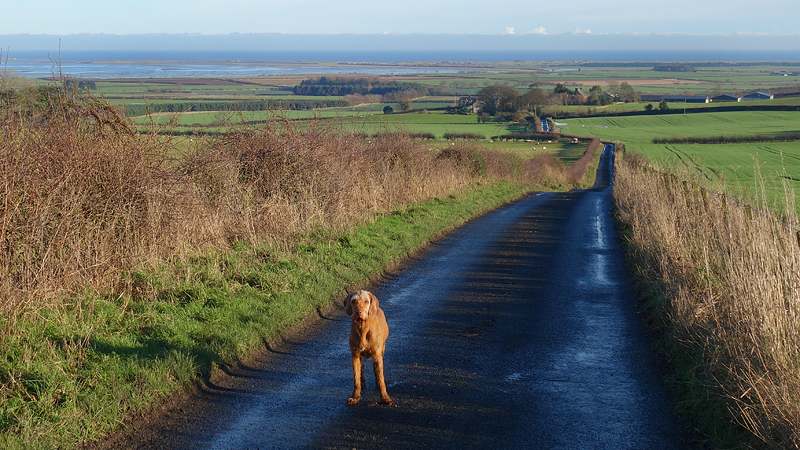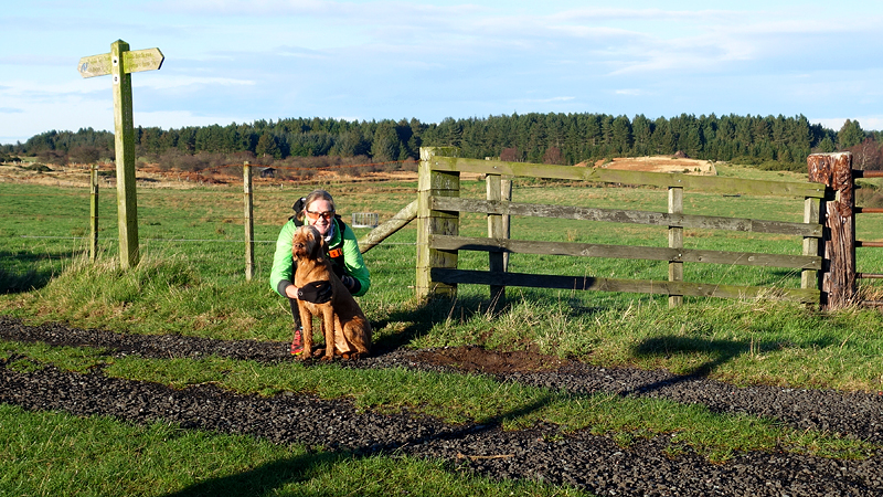 Ik kom uiteindelijk zonder kleerscheuren (alleen een beetje traag) bij het punt waar Holy Island vanuit de verte te zien is. Het is vandaag echt heerlijk weer met een zonnetje en geen wind. Ik sta even op het punt te kijken en maak een kiekje van woef en mij. Ik twijfel wat ik zal doen. Dit prachtige weer moet ik natuurlijk met beide handen aangrijpen om langer buiten te zijn. Woef lijkt ook OK en het naar haar zin te hebben en de weg die ik in gedachten heb, zou wel eens prima begaanbaar kunnen zijn want het is deels verharde weg en deels oud bos met een breed pad. Ik besluit het erop te wagen en sla rechtsaf en hobbel lekker naar beneden richting de houtfabriek. De poles zitten weer netjes op de rugzak en blijk ik de volgende 10 km ook niet meer nodig te hebben gelukkig.