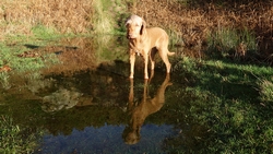 Op het pad naar de andere rotsen ligt een enorme diepe plas en woef neemt even een bad en een slokje.