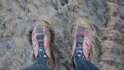 Ik weet dat er nu een stukje komt dat normaal zal zijn maar dat de laatste twee kilometers waarschijnlijk bagger zullen zijn. Dat is normaal al zacht en modderig dus ik ben benieuwd. Nou die modder was er! Van die dikke glij modder die ook zo heerlijk aan de schoenen blijft plakken…