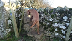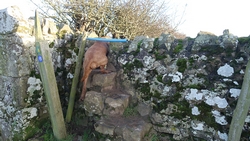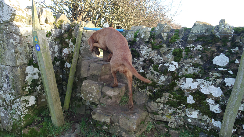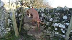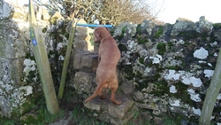 Maar aan alles komt een einde en al scheldend kom ik bij het muurtje waar woef weer als hinde overheen gaat. Vorig jaar had ze nog een ingepakt beentje vanwege die zwelling! Ik snap overigens niet dat die boeren een officieel pad zo verwaarlozen en zo kapot maken met zware machines. Niemand kan hier normaal overheen!