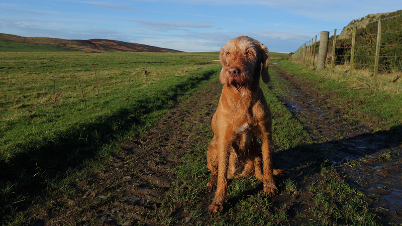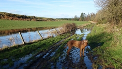 Het stuk achter het muurtje is iets minder kapot gereden en iets minder drassig maar we zijn er nu ook bijna. Als we van het veld afkomen, was ik woef even af bij het stomende beekje. Dat is geloof ik wel koud aan haar buikje en benen maar ze is wel lekker schoon nu. Nu mijn schoenen nog!