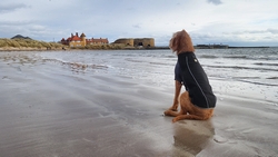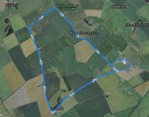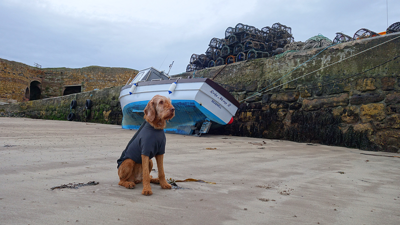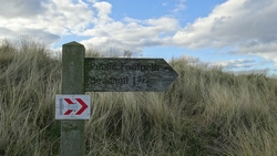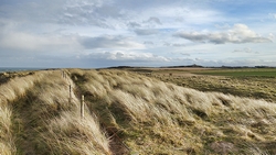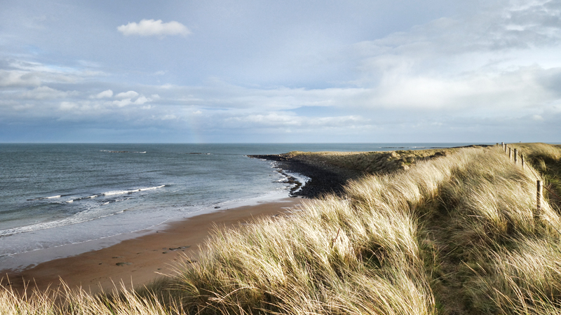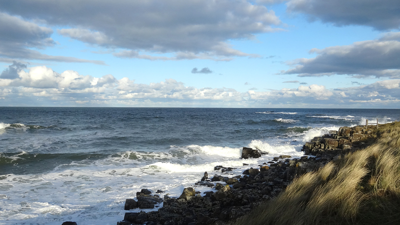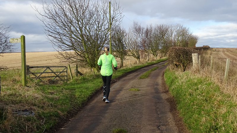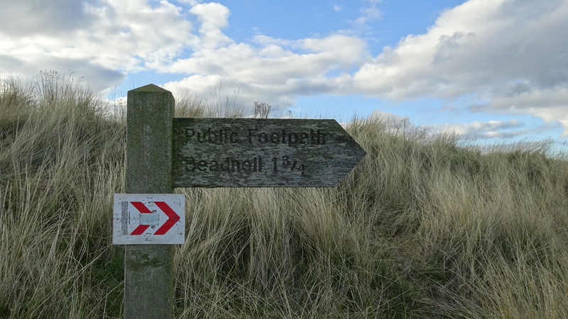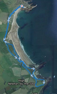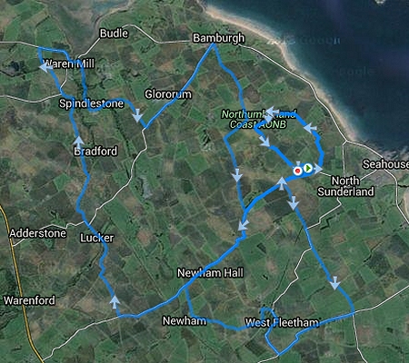 Nu gaat het opschieten. In Bamburgh neem ik weer de weg richting North Sunderland maar deze keer loop ik niet terug naar het huisje, maar sla bij de skihelling rechtsaf, loop naar beneden en weer naar boven en sla linksaf. Ik maak een extra lusje (dat ik dus normaal tegengesteld loop) omdat ik anders met te weinig kilometers bij woef ben en nog teveel ‘moet’ als tweede ronde. Bovendien komt dit ook niet verkeerd uit qua wind. Ik heb nu een stukje de wind in de rug. Een racefietser die me tegemoet komt, roept me dat ook toe. Dat ik de goede kant op loop zo met de wind mee. Vind ik ook!