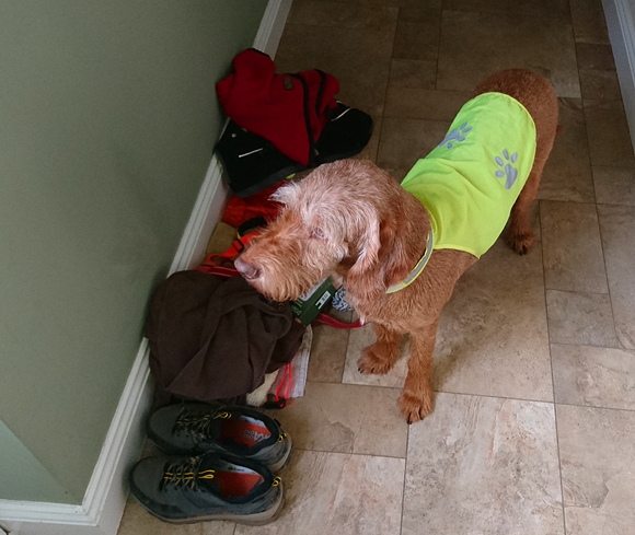 Maar goed, ook al zou dit de vierde achtereenvolgende dag zijn dat ik zou gaan lopen, de voorspelling qua weer was OK dus vooruit maar. Starten kan in ieder geval en onderweg kan ik altijd kijken hoe het allemaal loopt en voelt. Helaas had ik slecht geslapen omdat het heel erg koud ineens was geweest in huis. Misschien lag het aan mij, maar ik voelde me verder prima. Ik was dus al vroeg op (had een warme douche genomen om 4 am vanwege de kou ook nog) en kon op mijn gemak een eitje bakken. Alles lag verder al klaar. Rugzakje gevuld met water, riempje van waf bij de deur, schoenen voor offroad stukje bij de deur en op bed andere kleding voor het geval het ineens echt warm zou worden. Ik had bedacht dat ik het eerste stukje met woef zou gaan doen zodat zij lekker uit geweest was. Haar voederautomaat zou dan een poosje later openen voor een halve lunch en ik zou haar dan weer oppikken voor een kort rondje. Daarna zelf weer verder en het laatste rondje dan ook weer samen met haar. Dat is dus zeker niet ideaal, want doorlopen is veel fijner en omdat ik met haar offroad zou lopen, ben je dan helemaal uit je ritme. Maar het zou wel een goede oefening zijn, ook al in het ‘doorgaan’ want het is natuurlijk heel makkelijk om te stoppen nadat je deur hebt geopend om haar naar buiten te laten….