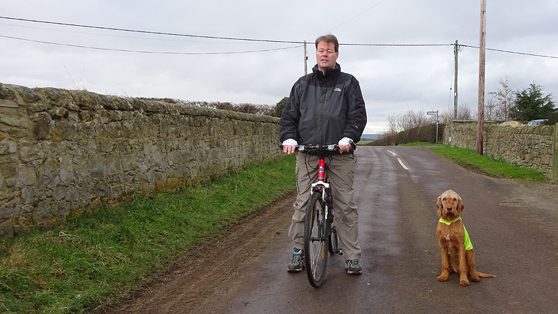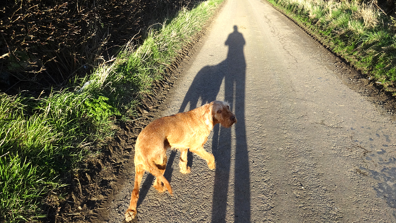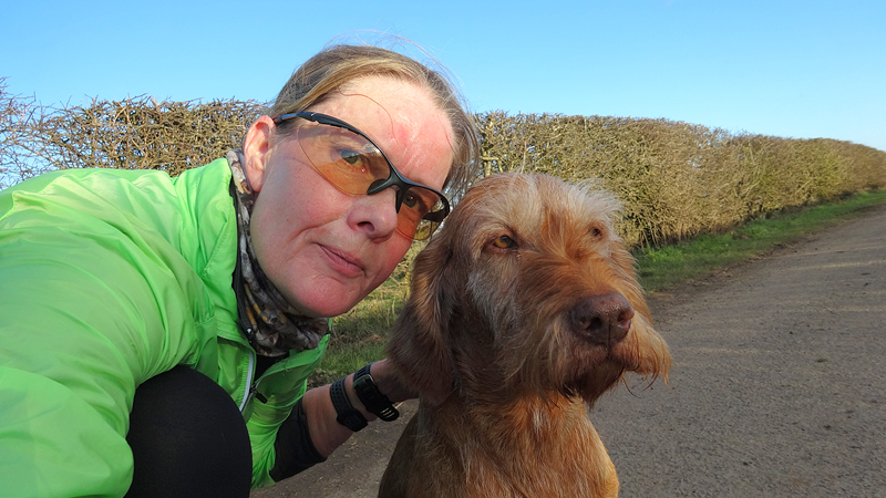 Met bijna 34 km op de teller haal ik woefje snel op voor haar rondje. Eerst weer die kloterige koude tegenwind op het erf…. Maar daar is wafje. Ze is blij om me te zien en vindt het wel leuk om weer op pad te gaan geloof ik. Goed geregeld zo. Ook nu ben ik weer afgekoeld en heb ik even moeite om weer op gang te komen. De werklui die vanaf vanmorgen met de schuur bezig zijn, kijken verrast op als ze me weer zien langskomen. Ik hoef gelukkig niks uit te leggen.