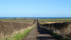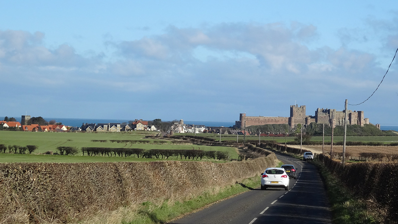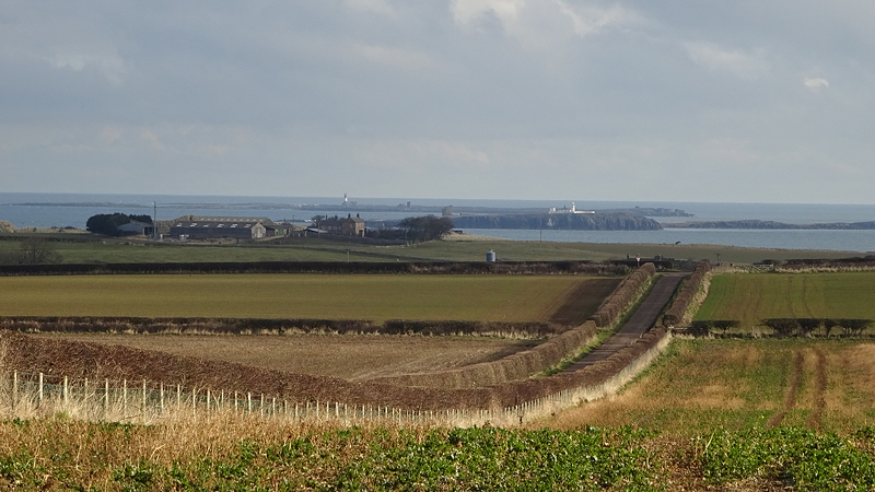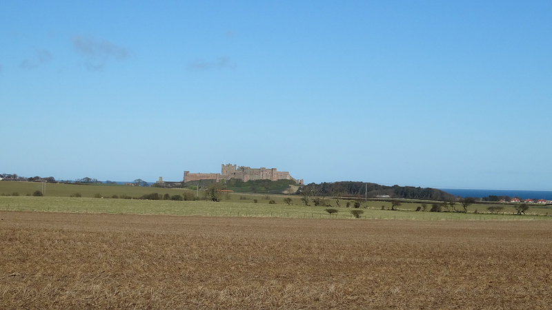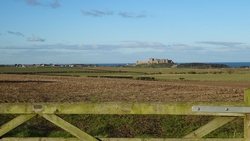 Ik loop verder nu richting Glororum.Ik liep daar de vorige keer ook en deed er ook enkele keren al een wegrondje met woef toen ze loops was en ik verder weg van het erf wilde lopen. Vanaf daar loop ik weer richting Bamburgh en ik zie in de verte het castle mooi in het zonnetje liggen.