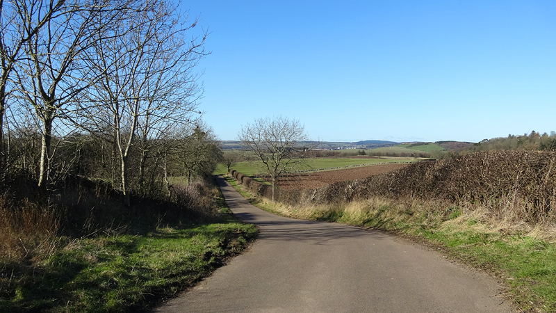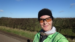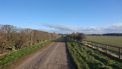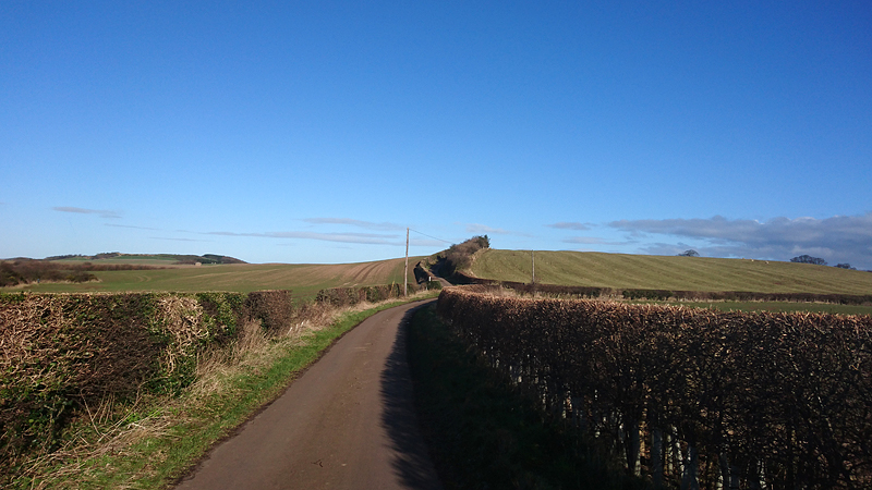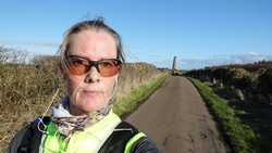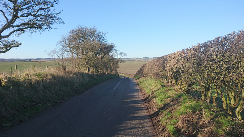 Ik ben wel verrast door de stevige wind. Die maakt het niet alleen fris maar maakt het lopen ook zwaar. Het begin heb ik zijwind en dat voelt goed. Is ook erg welkom want de weg golft daar vrolijk op en neer. Zijwind is dus wel prettig om mee te starten. Maar straks zal ik rechtsaf slaan richting Lucker en dan heb ik de wind dus volop kop. Dat zal niet meevallen maar dat ga ik allemaal nog ontdekken. Wat een eind moet ik eigenlijk!