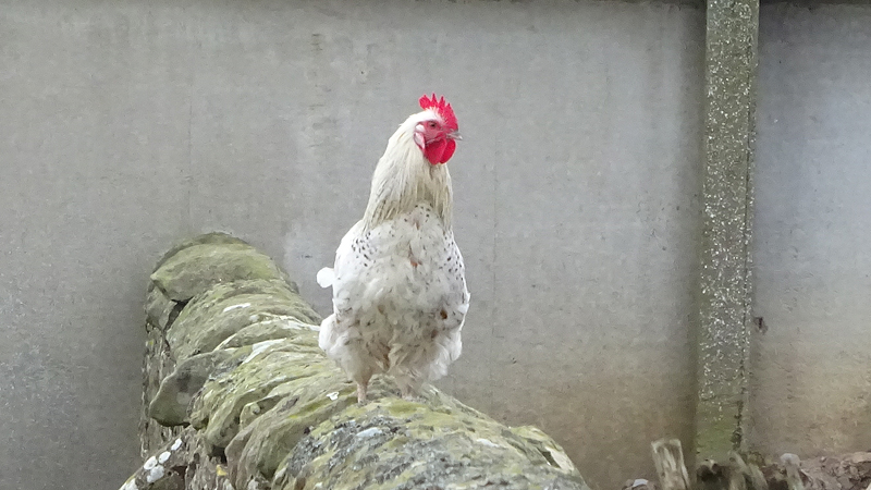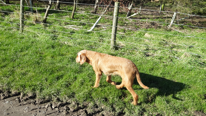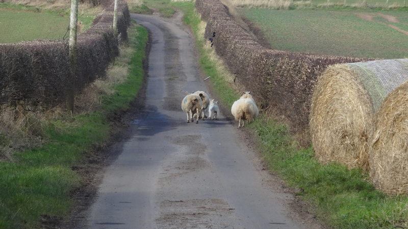 We lopen weer richting Shoreston. Dat is voor haar nou eenmaal een leuker rondje dan het normale wegrondje en hier kan ze ook lekker los. Hoewel…. als ik bij Clashope cottage ben, met de farm aan mijn linkerhand, zie ik ineens drie volwassen schapen met wat lammetjes over de weg lopen. Dat is vreemd want die horen daar niet en ik weet niet eens waar die lammetjes horen. Ik doe woef aan de riem maar de schapen blijven maar voor me uit rennen.