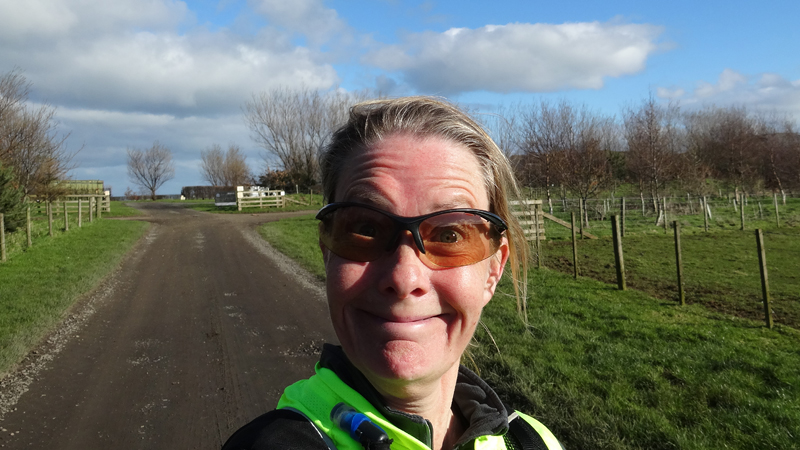 Ik wissel snel schoenen en ga weer op pad. Mijn hoofdband en handschoenen had ik al afgedaan toen ik het opgaande zonnetje voelde maar zo van het erf af in die rottige wind is wel erg koud. Ik heb mijn windjack ook uitgedaan en heb mijn aeroloftje aan. Brrrr niks an zeg. Maar al snel ben ik weer op weg en uit die wind op het erf. Dat wordt nog wat straks met rondje 2 als ik nog warmer ben…..