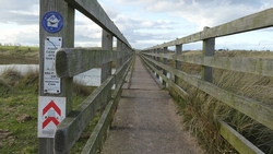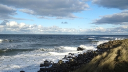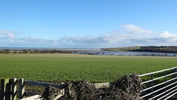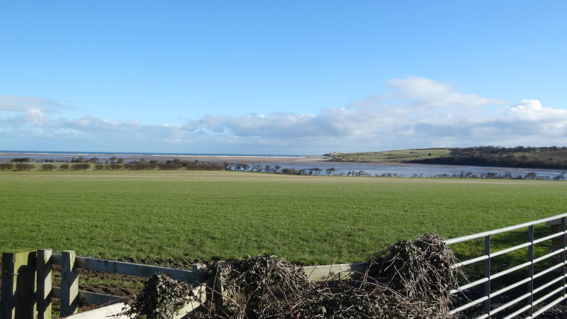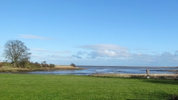 Ik loop weer verder en zie in de verte Budle Bay liggen. Mooi die witte golven en het blauwe water. Zo met het zonnetje ziet het er fraai uit allemaal. Ik hobbel over de weg en ben ineens even uit de wind. Dat voelt een stukje rustiger en loopt lekker. Al snel loop ik langs het water en even verderop er nog dichter langs. Grappig genoeg heb ik nog nooit het aanlokkelijke pad genomen dat richting het water loopt. Toch eens kijken op de kaart waar dat heen loopt. Mio is weer van slag en ik zet het ding maar even uit, zo heb ik er niks aan.