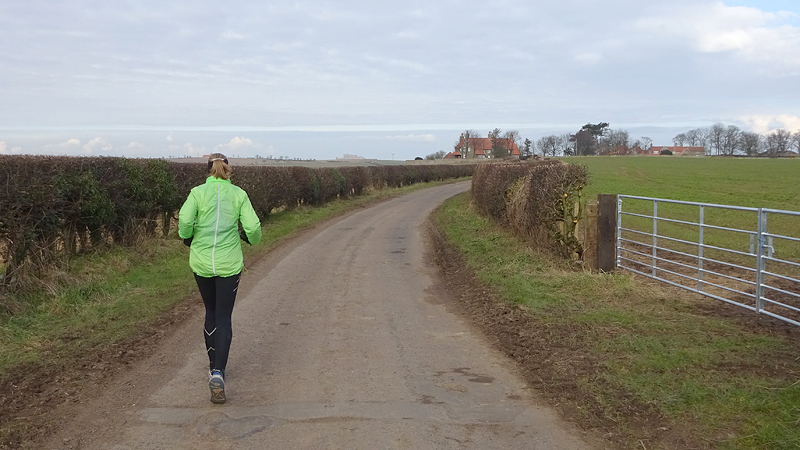 Ik ga op pad en wil aanvankelijk simpelweg tweemaal het wegrondje rond het huisje doen. Maar eigenlijk lijkt me dat niks en als ik rekening zou houden met de wind, is de route die ik eerder maakte om een keer te lopen zo gek nog niet. Die is 15 km, dus goed qua afstand en als ik linksaf sla vanaf de boerderij, heb ik een stuk de wind mee en een klein stuk tegen. Vreemd genoeg is de zon nu ineens volop aan het schijnen en even twijfel ik aan mijn jackje. Maar het is goed zo, het wordt immers ook steeds later. Gewoon verder lopen dus.