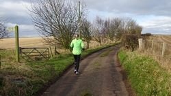 Na de bunker weer over de weg linksaf. Het is genoeg zo, ik voel niet de behoefte om nog verder te lopen alleen maar voor extra kilometers. Nog een klein stukje tot het huisje. De laatste 500 mtr wandel ik rustig uit als cool down. Ik zie op de farm een quad rijden maar hij is te ver weg om te vragen over de lammetjes.