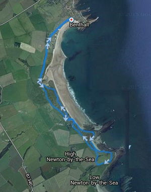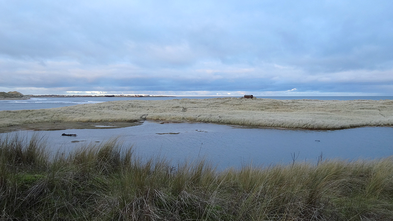 Ik weet niet zeker of ik wel tot Foxton door ga lopen. Het probleem is een beetje dat ik straks dezelfde weg weer terug moet. Dus weer door die shitzooi overal. Ik denk dat het veld naar Boulmer wel goed te doen zal zijn en verderop ook omdat dat oude duinen zijn. Maar dan nog…. Ik loop ook tot Boulmer en heb er dan wel genoeg van. Het laatste stuk was inderdaad prima te doen en daar kon ik lekker opschieten. Maar ik heb geen zin meer in de duinen en dan weer terug. Het is wel genoeg geweest, ook voor waf.