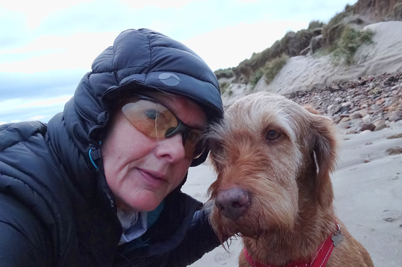 Ik kies weer voor Beadnell gezien het weer en de weg. Bovendien vindt woef het door de duinen ook helemaal leuk dus dat komt wel goed. Ik kies weer voor die nieuwe kousen en weer gebeurt hetzelfde. De eerste 4 kilometer voel ik mijn voeten. Volgende keer trek ik andere sokken aan, want misschien is mijn schoen een beetje ‘te vol’ met de sealskinz die ik ook nog aan heb vanwege de modder. Overigens hebben die gekke kousen al heel wat kilometers gezien ook al zijn ze niet waterdicht en laat de boord los aan de bovenkant.