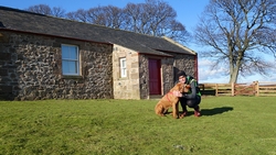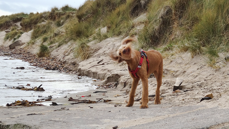 Daarna speelde woef even met twee kleine hondjes met een dekje. Twee dames horen bij de hondjes die gewapend met rugzakken gaan wandelen. Ik vermoed eigenlijk dat de naar Dunstanburgh gaan lopen maar ik weet niet waarom ik dat denk.