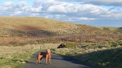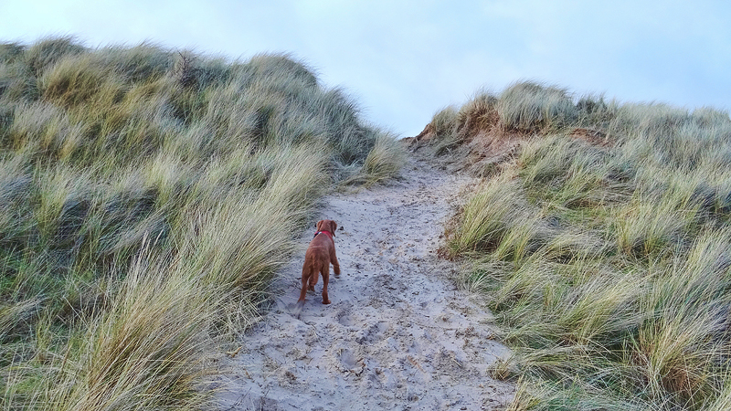 Na het spelen gaan we op pad voor ons rondje. Eerst even via het caravanpark en daarna door de duinen. Het loopt allemaal heerlijk en ik besluit weer dat extra lusje te maken bij Low Newton. Het is nog steeds droog dus we boffen enorm vandaag. Als ik op de terugweg ben van het lusje, zie ik de dames met de twee kleine hondjes weer. Ze zijn dus al tot Low Newton gekomen.
