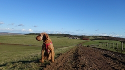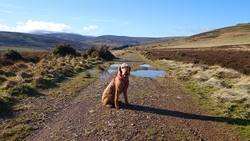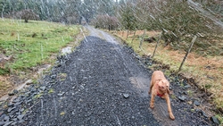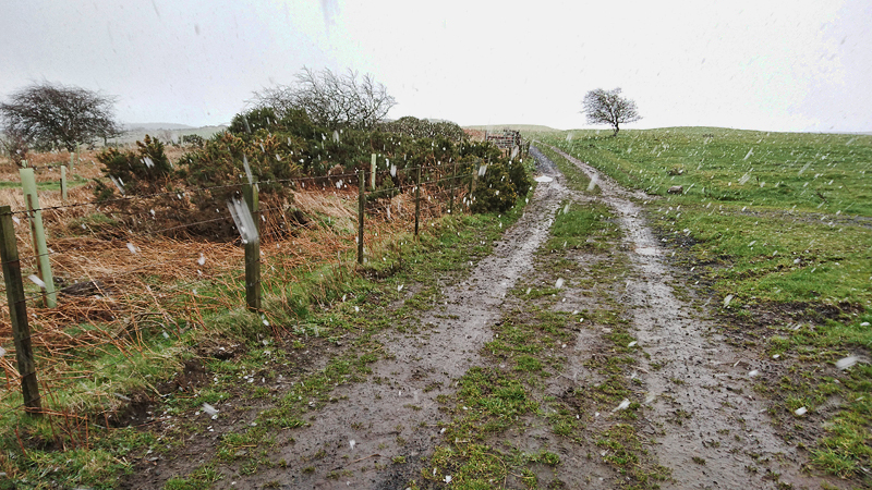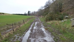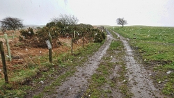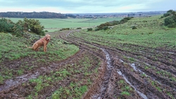 Het pad na de farm is erger dan ooit. Niet normaal maar ik weet dat na het weiland een stukje bos komt dus dat komt goed. Niet dus want door het bos hadden kennelijk paarden gedraafd voor een jachtpartij en daar was ook alles omgeploegd en modderig. Niet erg, straks kom ik op de weg bij de farm en kan ik lekkerder lopen. Dat klopt ook alleen stuit ik voor het eerst op een hek dat ik nauwelijks open krijg. Ik zie al dat ik straks ook een hek zal hebben dat dicht is (ik loop immers een achtje en kom straks bij het andere hek weer naar beneden). Wat een geklooi al. Het volgende stuk gaat prima en ik geniet van wafje en van het weer. Wordt het nou ineens kouder? Ik twijfel een beetje. Mijn handschoenen zijn al lang uit en ik wil eigenlijk mijn sleeves wel uitdoen. Maar toch aarzel ik. open gaat verder prima op wat rare stukken na die kapot gereden zijn door machines die bomen komen kappen en weghalen.