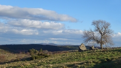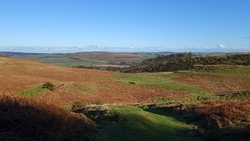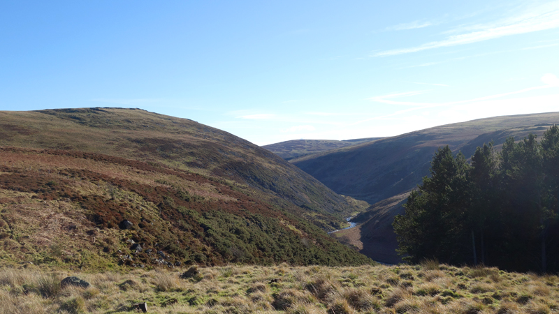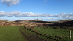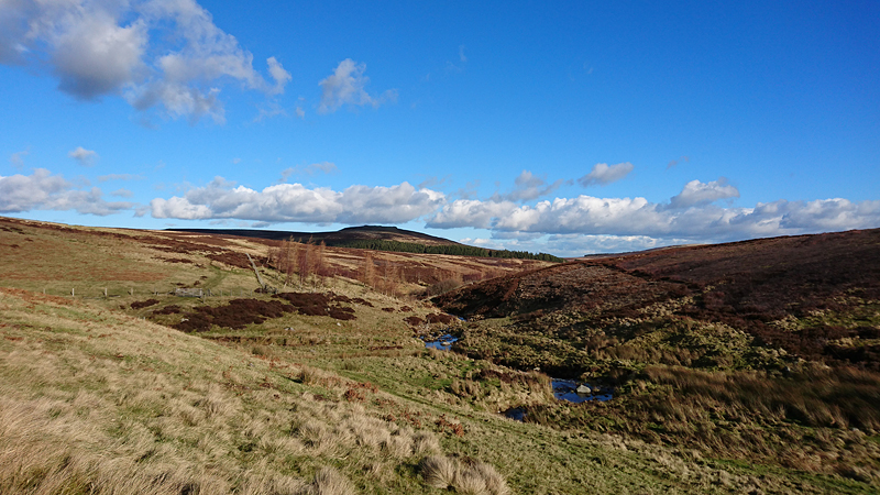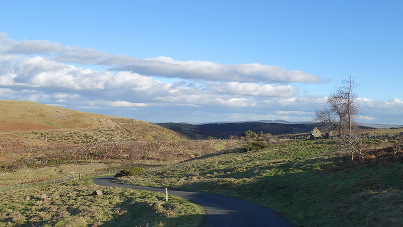 Nu komt op zich wel een mooi stuk. Deze keer is het helder en kan ik ver kijken. Ik zie beekjes slingeren tussen de heuvels. Jammer genoeg staat de zon eigenlijk net verkeerd om dat vast te leggen.