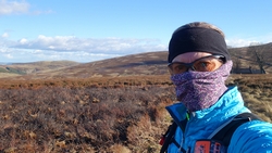 Ik laat de drone op omdat ik hier nu toch ben. Maar of het nou zo waait of dat er iets mis is, de drone laat zich bijna niet besturen. Er is ook weinig te zien zo van bovenaf eigenlijk. Kale vlakte. De details vallen eigenlijk weg. De drone vliegt ineens weg. Nou daaag dan! Maar uiteindelijk krijg ik toch weer contact en laat ik het geval landen. Ik heb mijn Nanopuff gelukkig aan want ik heb het koud. Ik ruim alles weer op en twijfel. Nanopuff aanhouden? Ik weet dat er nu een stukje komt waar niet veel van hardlopen terecht gaat komen dus dat zal koud zijn. Ik besluit de Nanopuff aan te houden. Misschien stik ik wel, want ik heb mijn sleeves aan en mijn aeroloftje. Maar ik ga eerst maar eens op pad. Pad? Welk pad?