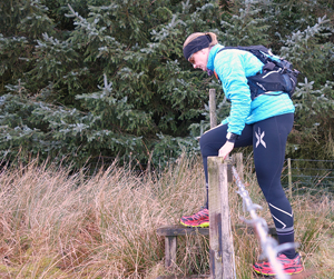 Ik loop het laatste stukje door het bos en maak weer een hek open. Van dit hek weet ik al dat ik soms moet duwen en soms omhoog moet trekken maar uiteindelijk krijg ik deze ook open. Ik loop nu even vol op in de wind en voel een druppeltje. Kleintje. Zou dit een spotty shower zijn zoals het wel eens te lezen valt in de voorspellingen? Ik zie het wel. Kan er toch niets aan veranderen maar het zou wel vervelend zijn zo met dit dons giletje aan. Voor waf heb ik ook niks bij me, niet eens haar equafleece voor na de run. Was niet nodig met dit weer toch?