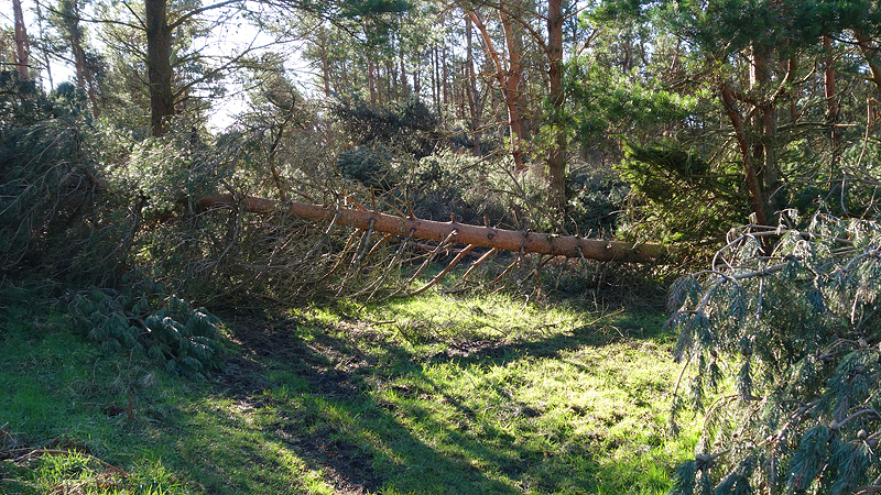Ik loop door en zie de eerste boom liggen. De storm heeft hier echt huisgehouden dat is duidelijk. Maar als ik verder wil, kan ik eigenlijk nergens langs. Wat een geklooit. Ik klim over stronken en hoop dat de drone niet aan de takken blijft hangen. Woef doet ook haar best. Als ik een pad volg, herken ik het niet en kijkens op de kaart, zie ik dat ik verkeerd ben. Het pad dat ik moet hebben, is afgesloten.