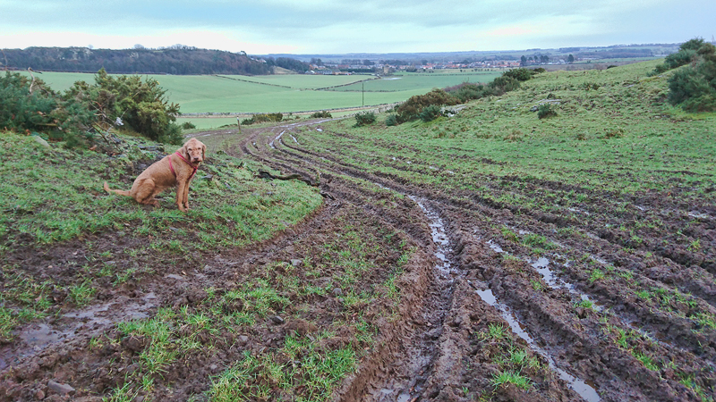 ‘Nee’ muit mijn andere hersenhelft. Klote paden, klote boeren die alle paden kapot maken met die stomme machines. Nou dat laatste klopt wel want het volgende stuk is ook allemaal kapot gereden. Inmiddels ben ik best een aardige modderloper maar op sommige korte steile stukjes naar beneden ben ik echt een schijterd als er van die enge glij troep ligt. Waf niet, die dendert gewoon naar beneden op haar sublieme spikes. En wacht dan af of ik ook nog eens kom.