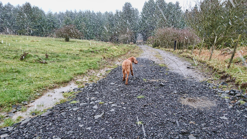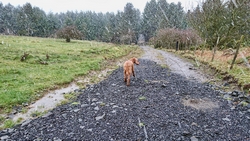 We hobbelen door en langzaam stopt het met sneeuwen/regen. Dat valt alweer mee. We zijn bijna bij de cave. Ik maak bliksemsnel een kiekje van een natte zielige woef en loop weer hard verder.