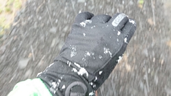 Het stukje bos dat dan komt, is ook aardig begaanbaar. Ik probeer half half te genieten van de witte vlokken maar ik ben koud geworden van het omkleden en wil nu eerst warm worden. Mijn handschoenen zijn doornat maar ik hou ze aan omdat het wel helpt tegen de wind. Was dit nou het rondje zonder verrassingen dat ik voor ogen had?