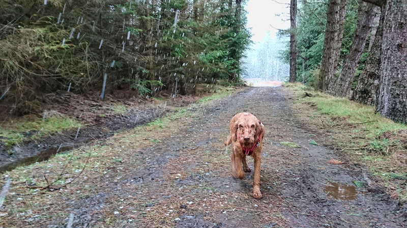 Woef vindt er weinig aan geloof ik maar loopt braaf mee. Ze is gelukkig lekker droog gebleven op haar rug dus dat is mooi. Ik maak op het erf haar voetjes schoon met de slang. Binnen droog maken.