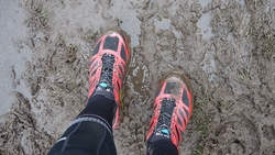 Ik neem het pad achter de huizen langs want ik vrees dat het pad tussen de zeel en de huizen voorlangs niet te doen is. Ik hoor later dat dat inderdaad zo was, want ik kom een stukje verder een echtpaar tegen waar ik even mee aan de praat raak. Het is namelijk een gigantische moddertroep. Eigenlijk zoals het was in 2014 toen ik voor het eerst het parcours van de ultra verkende. Glij modder. Ik weet dus nu weer dat het echt verschilt want de vorige keren was het wel modderig maar eigenlijk goed te doen.