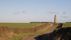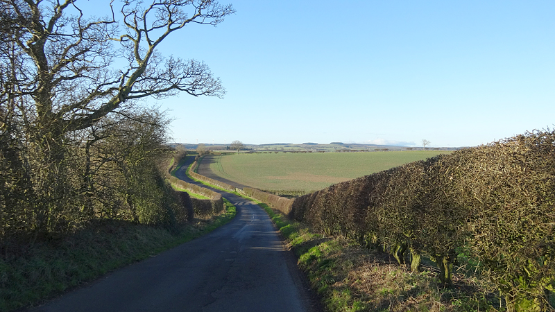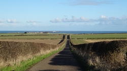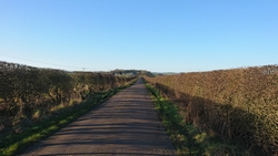 Bij Elford sla ik rechtsaf en dan weet ik toch echt zeker dat ik heel nodig moet plassen. Snel duik ik een bridleway op en ga achter de heg zitten. Geen hond die het ziet en een hele opluchting. Gauw verder met het laatste stukje! Bij de afslag richting de zee zie ik de Farne Islands in de verte liggen. Gauw een kiekje van deze gekke weg. Even naar beneden en dan een stukje omhoog.