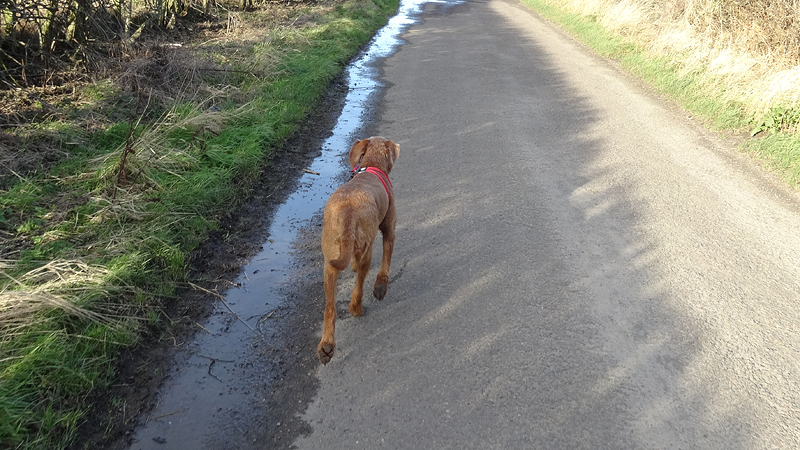 Samen met woef eerst weer het bekende rondje. Ze vindt het leuk en is blij dat ze ook lekker buiten is. We maken het rondje af en lopen weer langs de cottage. Nu naar Shoreston. De reutjes zullen wel weg zijn inmiddels. Het lopen gaat nog steeds prima. Het is net alsof ik pas net vertrokken ben eigenlijk. Ik neem dus de lange lus via de bunker en de rotzooi. Als ik daar weer de weg op kom, twijfel ik even. Zal ik rechtsaf slaan en er nog een lusje aan vast maken? Ik weet in de gauwigheid niet hoe lang dat dan is en er staat al bijna 46 km op de teller. Terug naar de cottage dan maar.