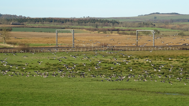 Bij de spoorbaan zit een gigantische groep ganzen. Vooral de brandganzen zijn schuw en vliegen op als ik voorbij kom lopen. Op grote afstand van de groep maar desondanks vliegen ze toch op. Een prachtig gezicht en ik probeer snel een foto te maken.