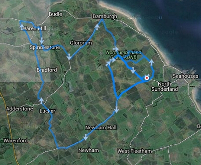 Bij Glororum zou ik eigenlijk rechtsaf willen slaan maar omdat ik zie dat ik nog wel een stukje moet, loop ik rechtdoor zo naar Bamburgh. Ik weet dat ik in het dorp uit zal komen en weer een andere weg terug kan nemen die weer op de bekende route uit zal komen. Ik begin nu een beetje te rekenen en denk dat ik helemaal niet zo slecht uit zal komen als ik nog een normaal rondje doe.