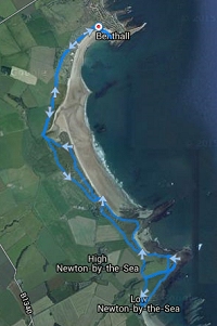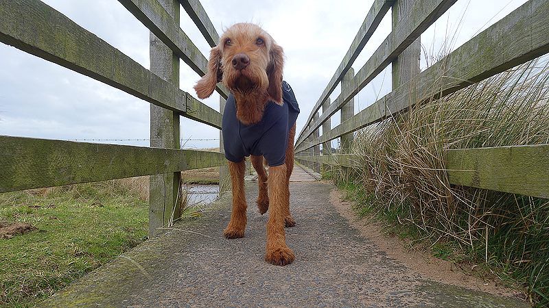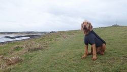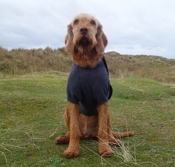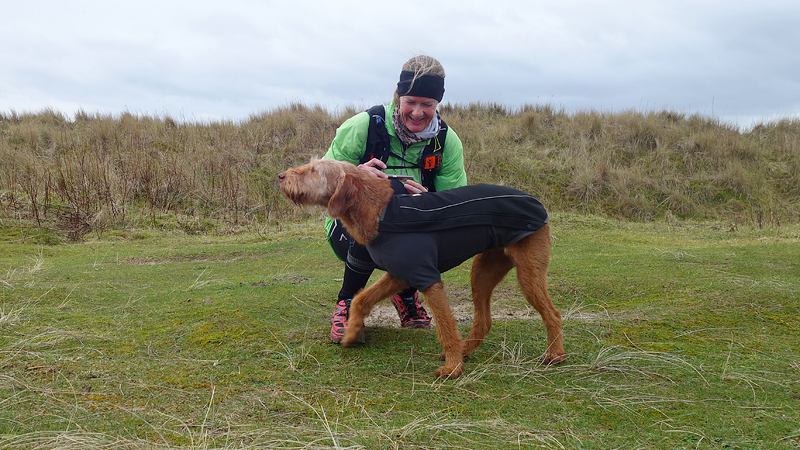 Vanmorgen waren waf en ik op Beadnell en aangezien het nog droog is, gaan we in de middag wederom naar Beadnell voor een rondje samen. Niks wegrondje zonder waf, gewoon samen door de duinen. Voor de zekerheid trek ik haar wel de cloudchaser aan want ik verwacht nog steeds een bui eigenlijk.