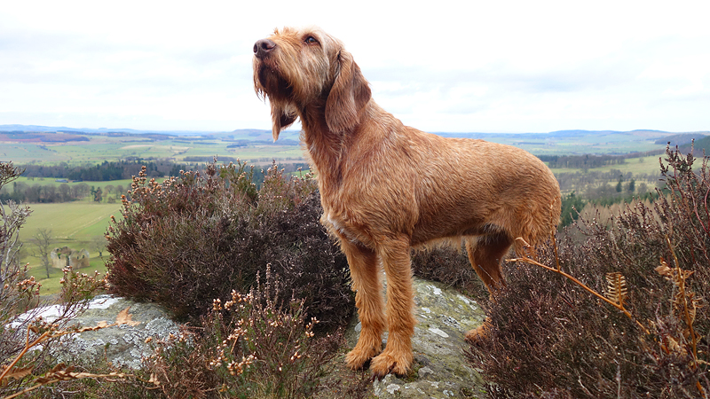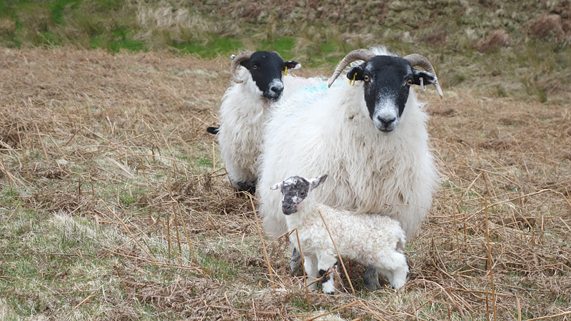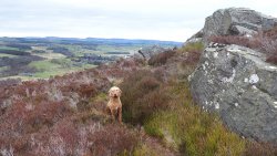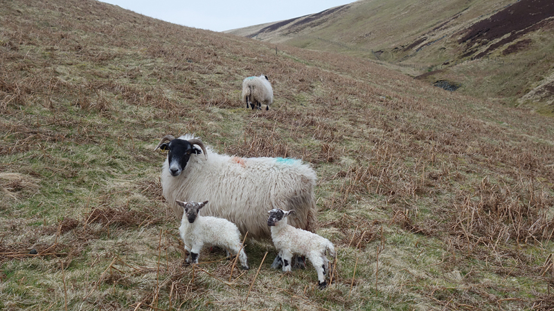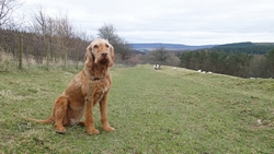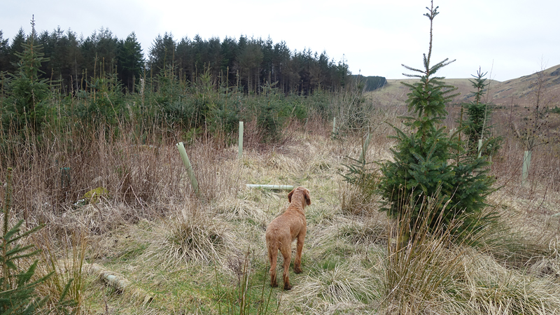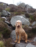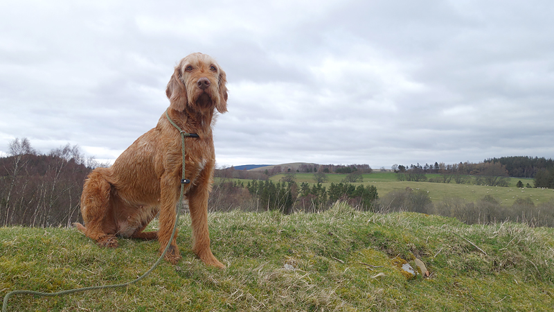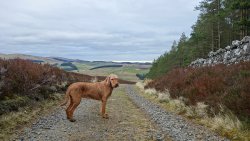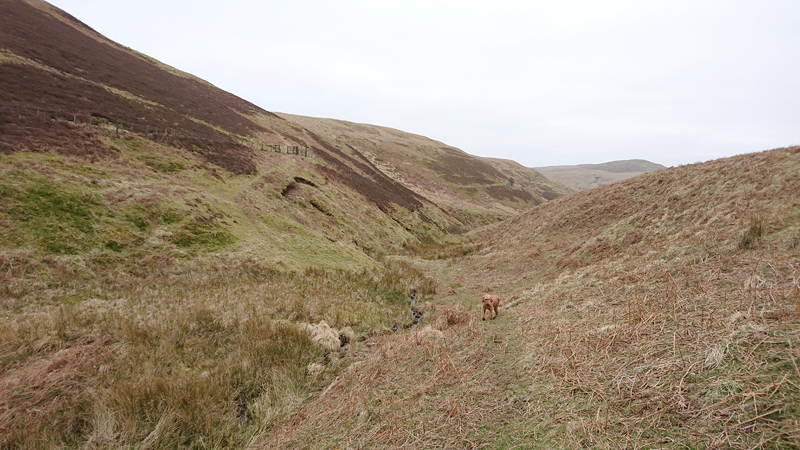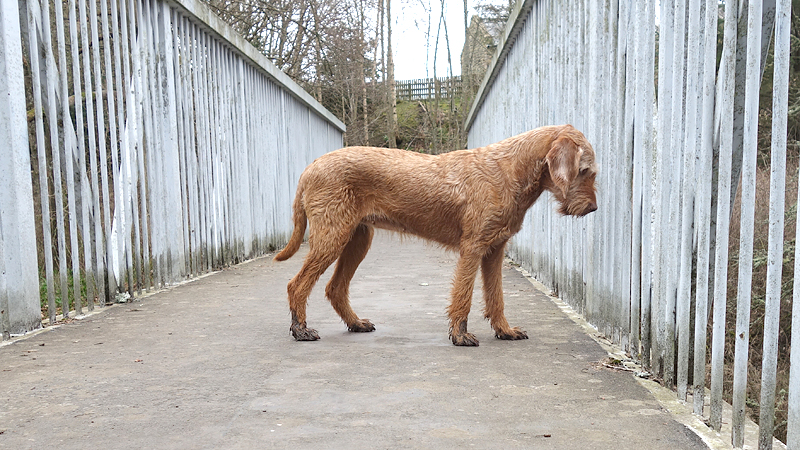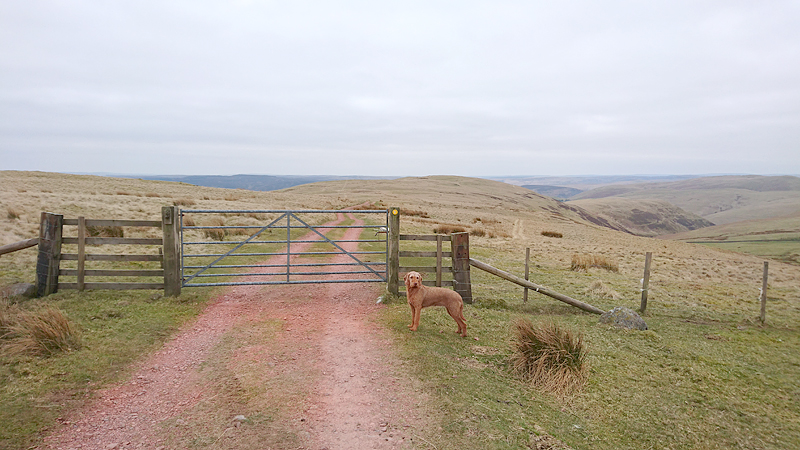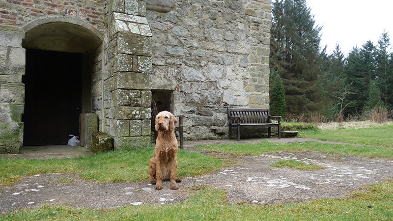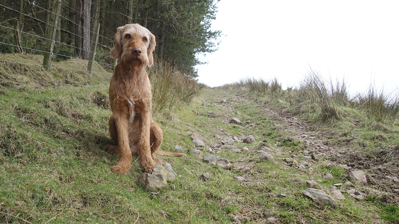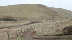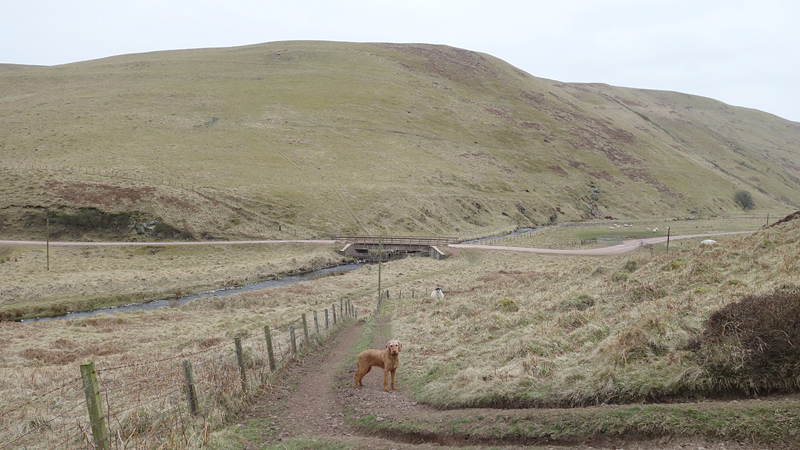 Even nog een paadje langs het watertje en daarna steken we een riviertje weer over dat zo richting Harbottle zal leiden. Het was een beetje modderig maar ik doe net alsof ik het niet zie en ga ervan uit dat wafje wel weer ‘schoon’ loopt straks. Op onderstaand foto heeft ze leuke zwarte voetjes.