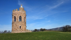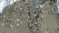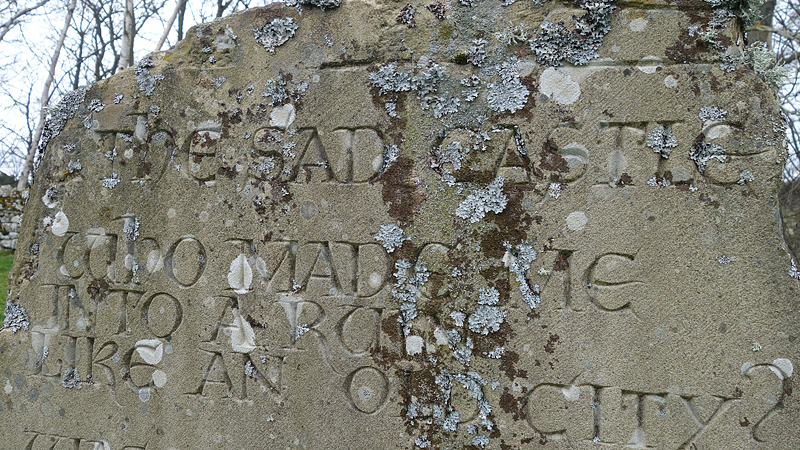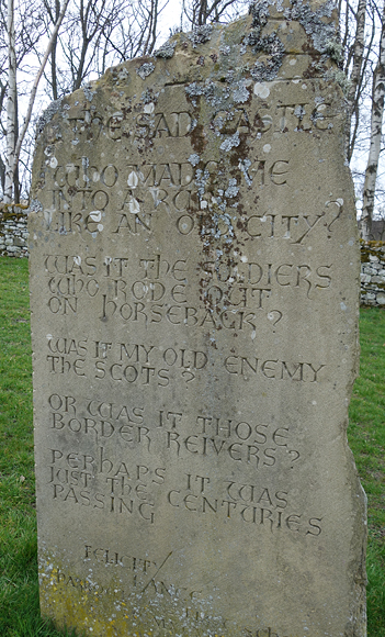 Als we het dorp weer uitlopen, zie ik de parkeerplaats voor het castle. Daar praat ik even met iemand die met een allesbrander koffie staat te maken. Daarna loop ik verder richting het castle, maar ik kijk eerst even op de steen met het kinderversje over het sad castle.