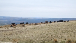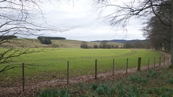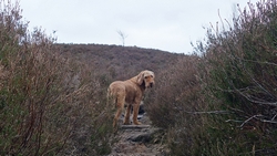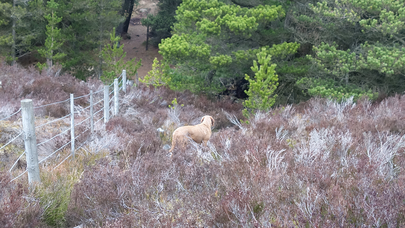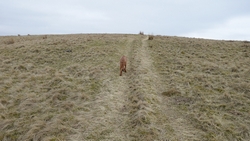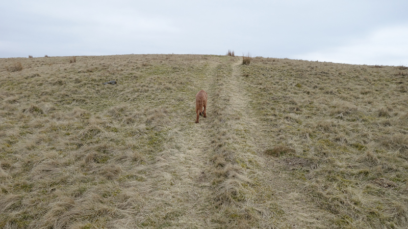 Aan de andere kant van het weiland is een muur met een rare opstap. Daar ga ik waf niet overheen gooien als het niet hoeft. Ik zie verderop weer beneden aan het weiland een hek en zo kan het ook kennelijk, dus lopen we maar weer naar beneden richting het hek. Schiet niet echt op zo….. Maar we komen bij de ingang van een parkeerplaats en kunnen op die manier ook weer op mijn pad komen.