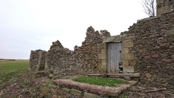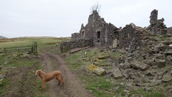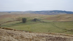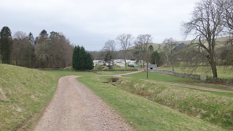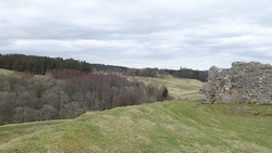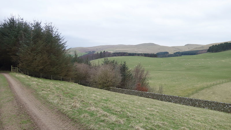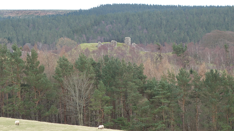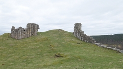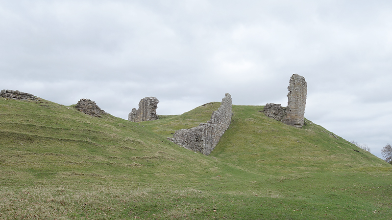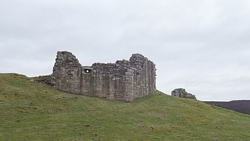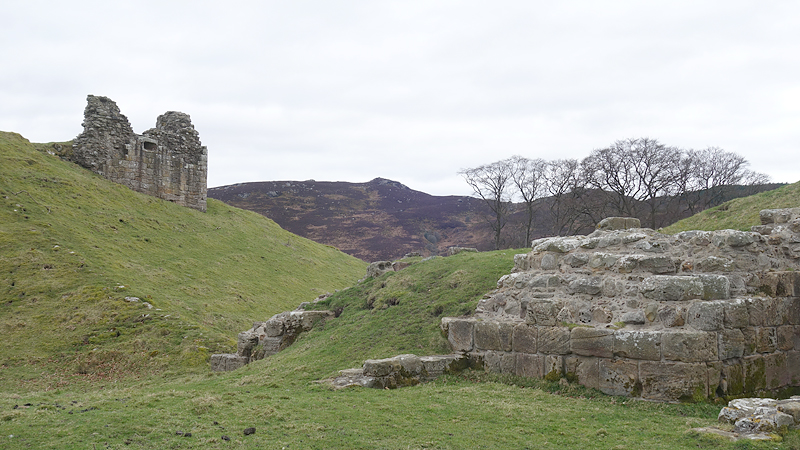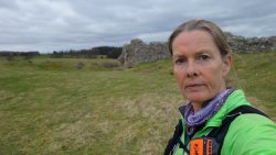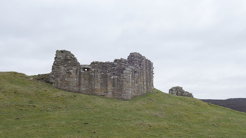 De weg klimt aardig maar is verder een echt pad. Meer een weg en later zie ik waarom. Er staan enkele huizen aan het einde van de weg. Mooie plek maar wel erg stil. Daarna loop ik een stukje door en zie ik rechts van me ineens al de ruïnes van harbottle castle (1160). Dat wordt ook wel ‘The sad castle’ genoemd. Dat is ook een reisdoel maar ik moet daarvoor eerst om harbottle heen lopen. Het gaat allemaal prima. Jammer dat het heerlijke zonnetje weg is maar voor lopen is het wel fijner.