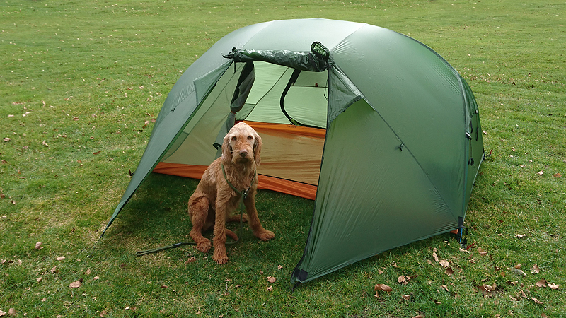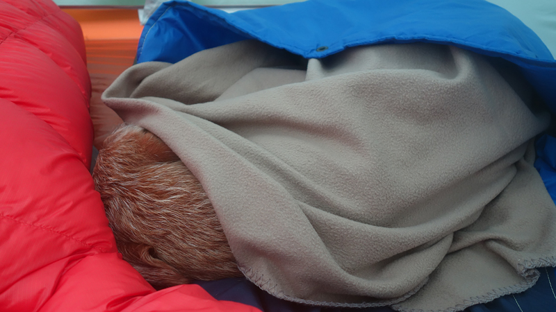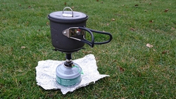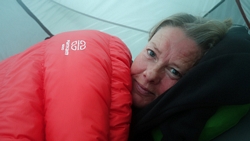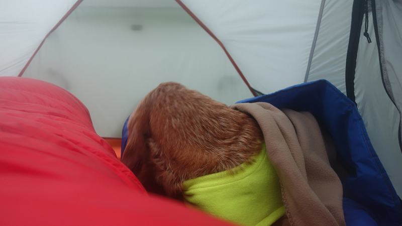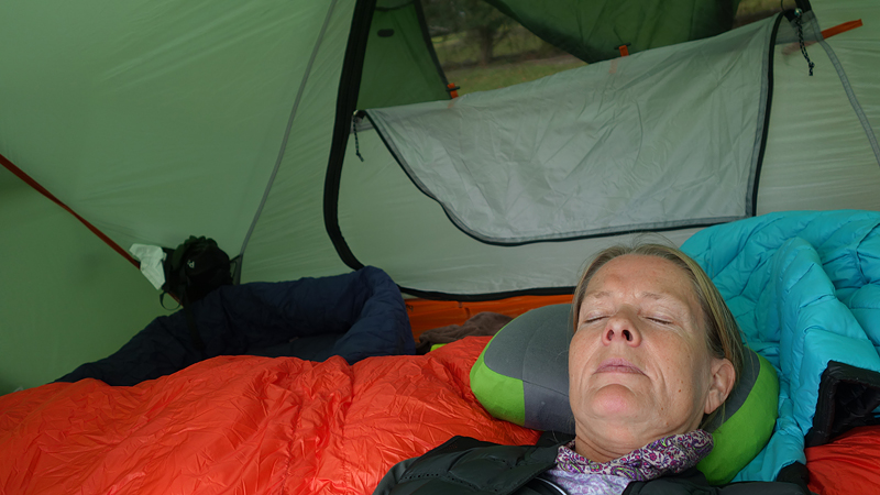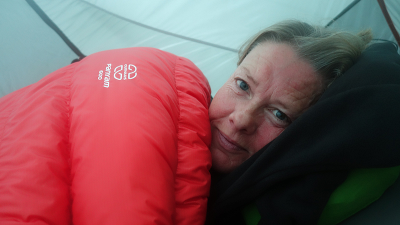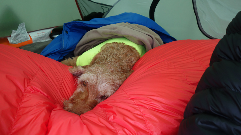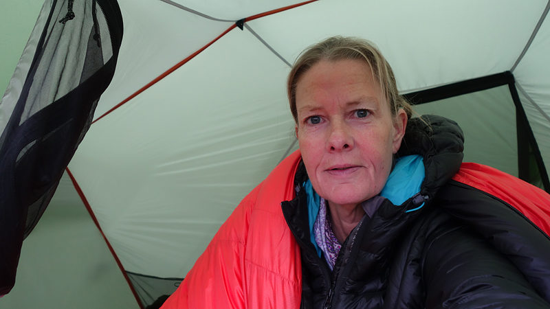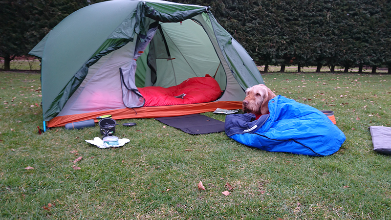 Na 12 km staan we weer bij de tent. Ik geef woef eten en kleed me om. Daarna maak ik een warme chocolade melk. Lekker hoor. Ik besluit ook een soep te proberen. Mijn gasstelletje doet het prima en in no time heb ik tweemaal water gekookt met mijn kleine esbit pannetje.