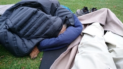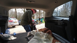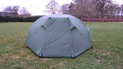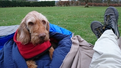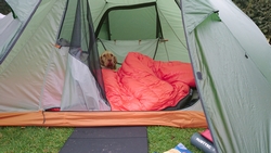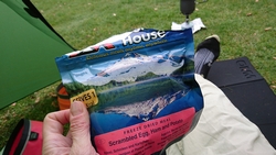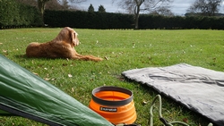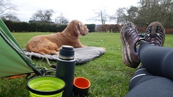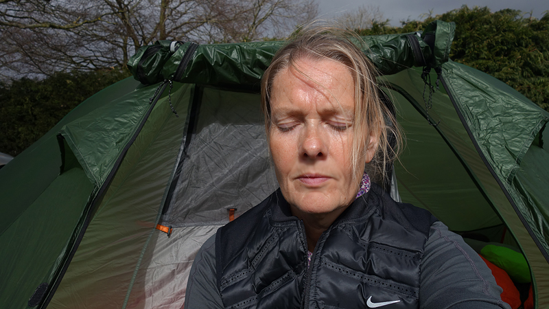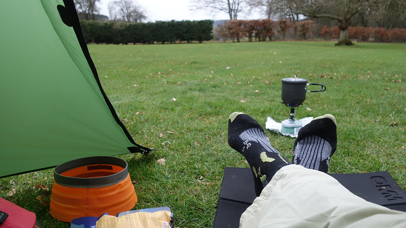 Ik betaal 10,50 pond en krijg een papiertje met de code voor de douche en plee en ga naar het veld. Ik bestudeer het veld en kijk naar de zon. Deze keer zal ik daar goed rekening mee houden voor het geval het morgen vroeg ook nog mooi weer is. Voor het eerst zet ik de parula op maar dat gaat heel makkelijk en in no time staat de tent op zijn plek. Omdat ik vroeg ben en het zonnetje zo heerlijk schijnt, ga ik eerst wat warme chocomel drinken bij de tent. Ik lig dus gewoon op 22 maart in de zon half in mijn tentje!