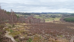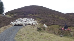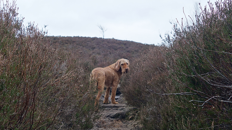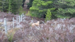 Uiteindelijk komen we het bos uit en op een heidegebied. Ook fraai. Ineens komt een grote groep schapen op me af. Die worden vast gedreven en dat klopt. Hoewel ik netjes blijf wachten kijkt de schreeuwende boer niet op of om. Hij schreeuwt alleen maar tegen de hond. Uiteindelijk zijn ze voorbij en kunnen wij weer verder.