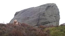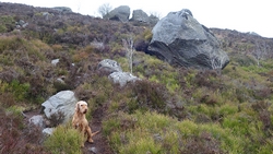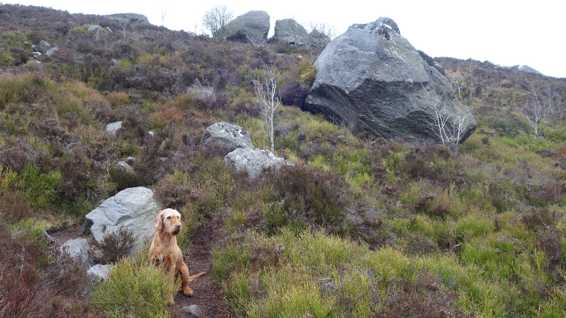 Waf loopt blij door en heeft het leuk. Ik zie boven me enorme blokken. Dat zal drake stone dan zijn. We moeten nog even door. Waf slaat wat linksaf. Ik kijk op de kaart en denk dat ze gelijk heeft. Links aanhouden voor de stones.