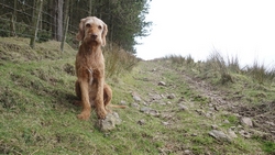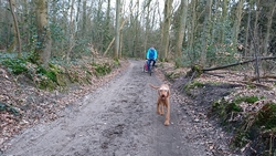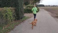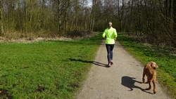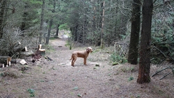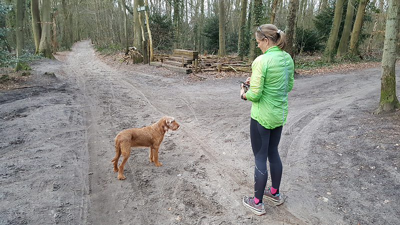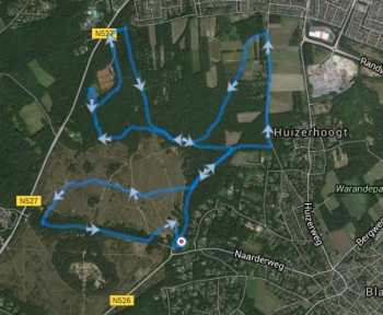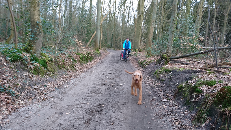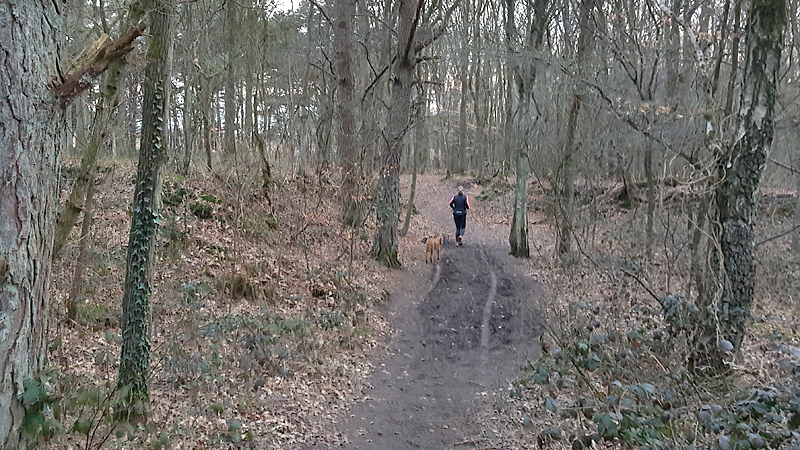 Na het meer rechtsaf richting bos. We lopen daarbij net voor de danger zone. Het bos is mooi en loopt lekker. Waf loopt een eind voor me uit.