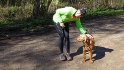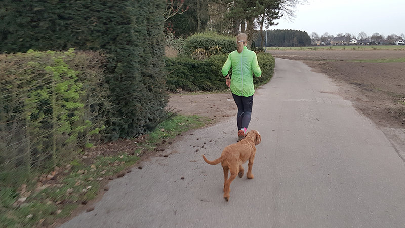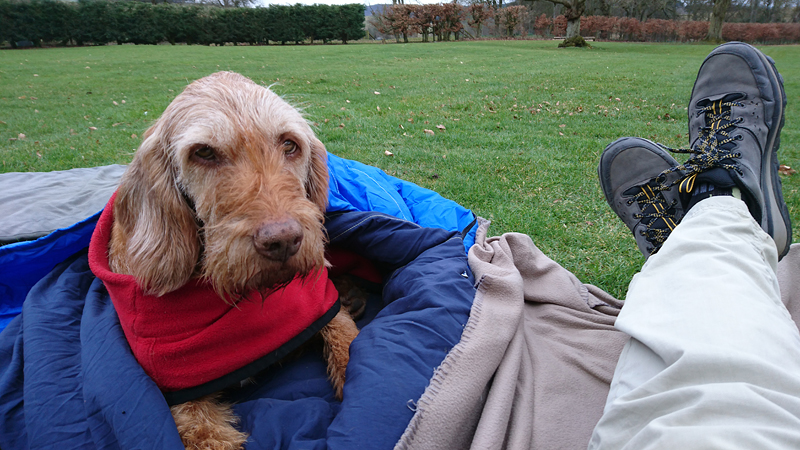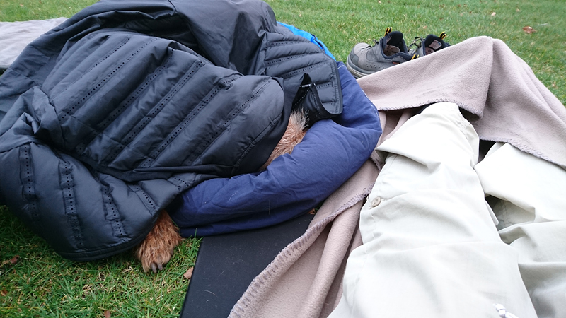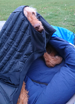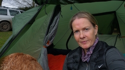 Het is toch wel apart weer om zo na de run lekker bij de tent te zitten met woef Ik heb me omgekleed in de tent na de run en ben al lekker warm. Ik heb een goede keuze gemaakt qua kleding geloof ik. Waf is ook warm alleen haar kopje lijkt wat koud. Ik leg mijn aeroloft jack maar gewoon lekker over haar heen en dat vindt ze prima geloof ik.