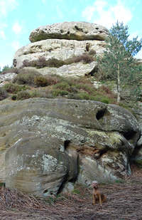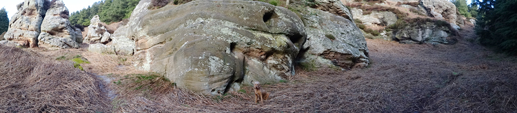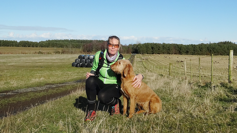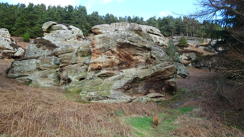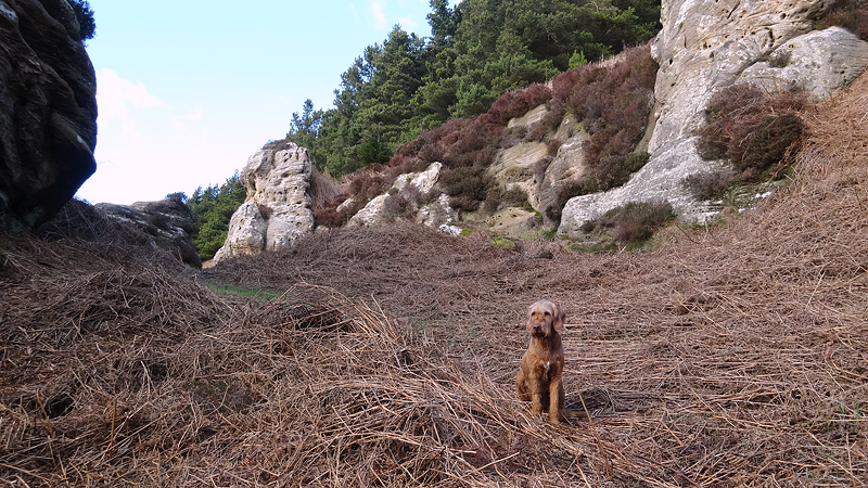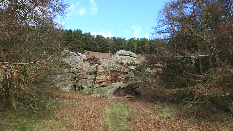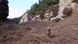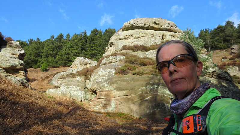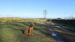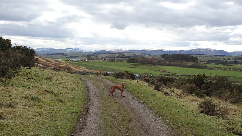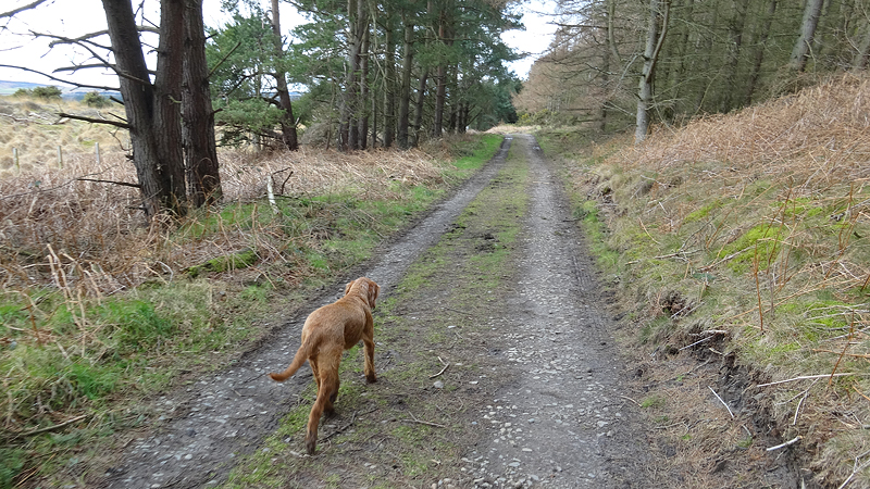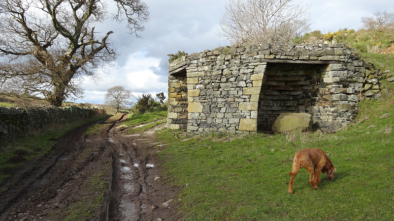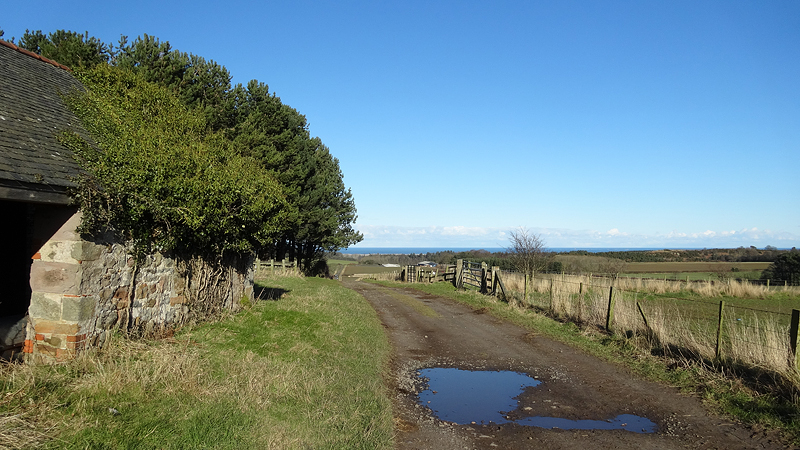 Ik loop door en dan ineens wijst de pijl ergens naar rechts voor een muur. Is dat echt een pad? Rare jongens die engelsen. Ik kom zelfs een wandelaar tegen en ik vraag waar hij gestart is. Hij mompelt iets over een parkeerplaats en als ik vraag of er iets te zien is van Ros castle zegt hij dat er alleen een bord met informatie staat. Ik loop weer door en baal een beetje van het rare pad dat nu volgt.